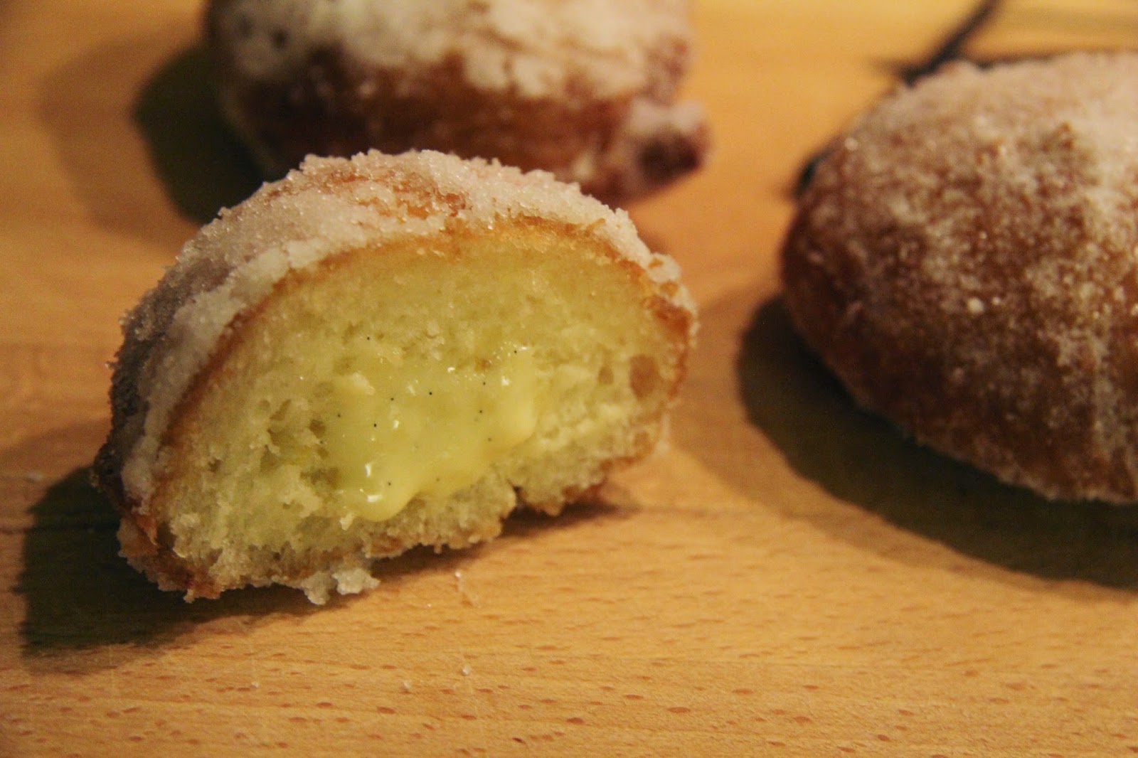 Få saker är lika gott som nyfriterade munkar. Kanske nyfriterade VANILJmunkar… De här munkarna är luftiga och goda med en krämig vaniljfyllning i mitten. Receptet har jag komponerat ihop själv.