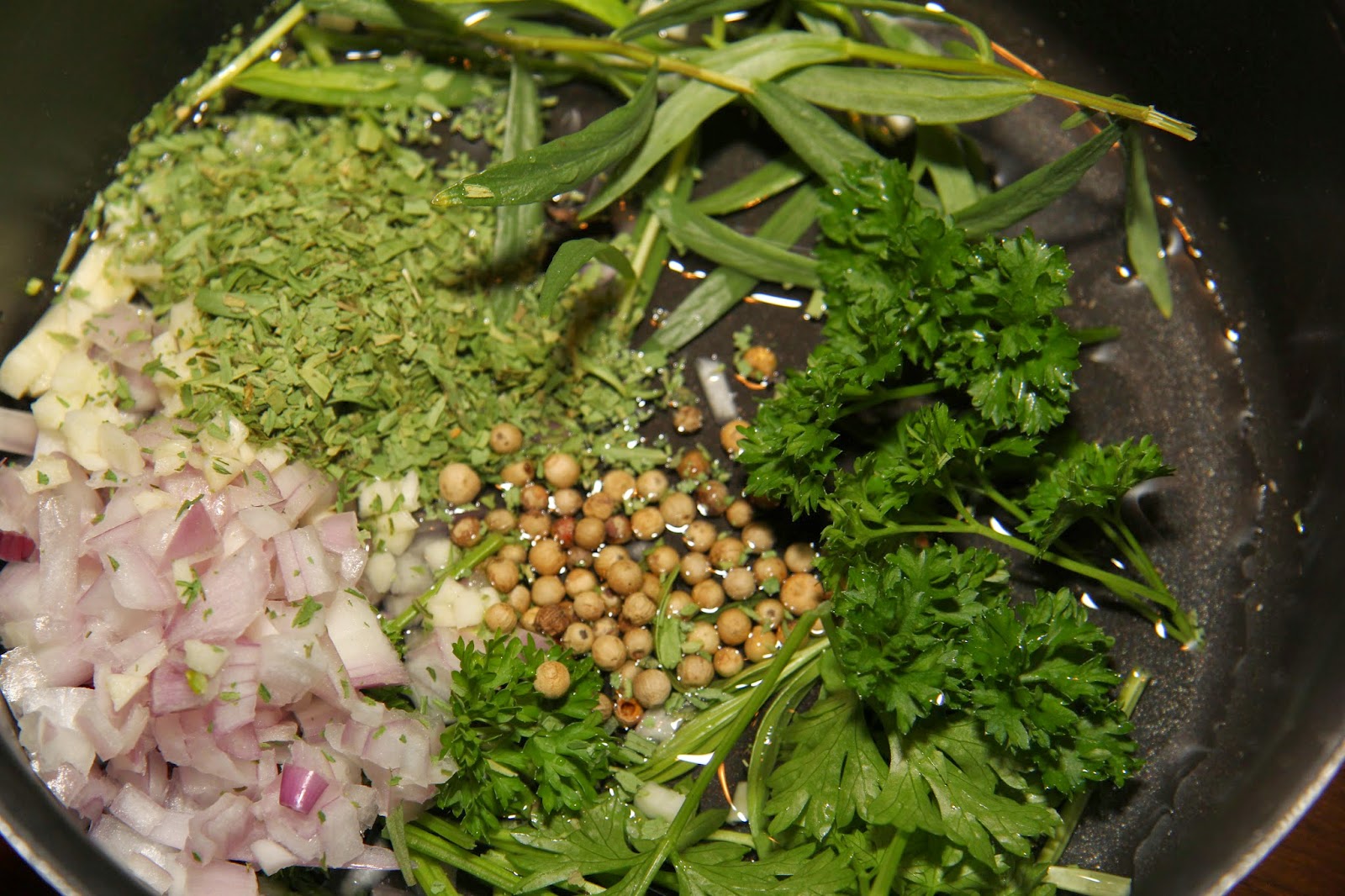 2. Blanda. finhackad lök, färsk persilja, färsk dragon, vitpepparkorn, torkad dragon, vitvinsvinäger och vatten i en kastrull.