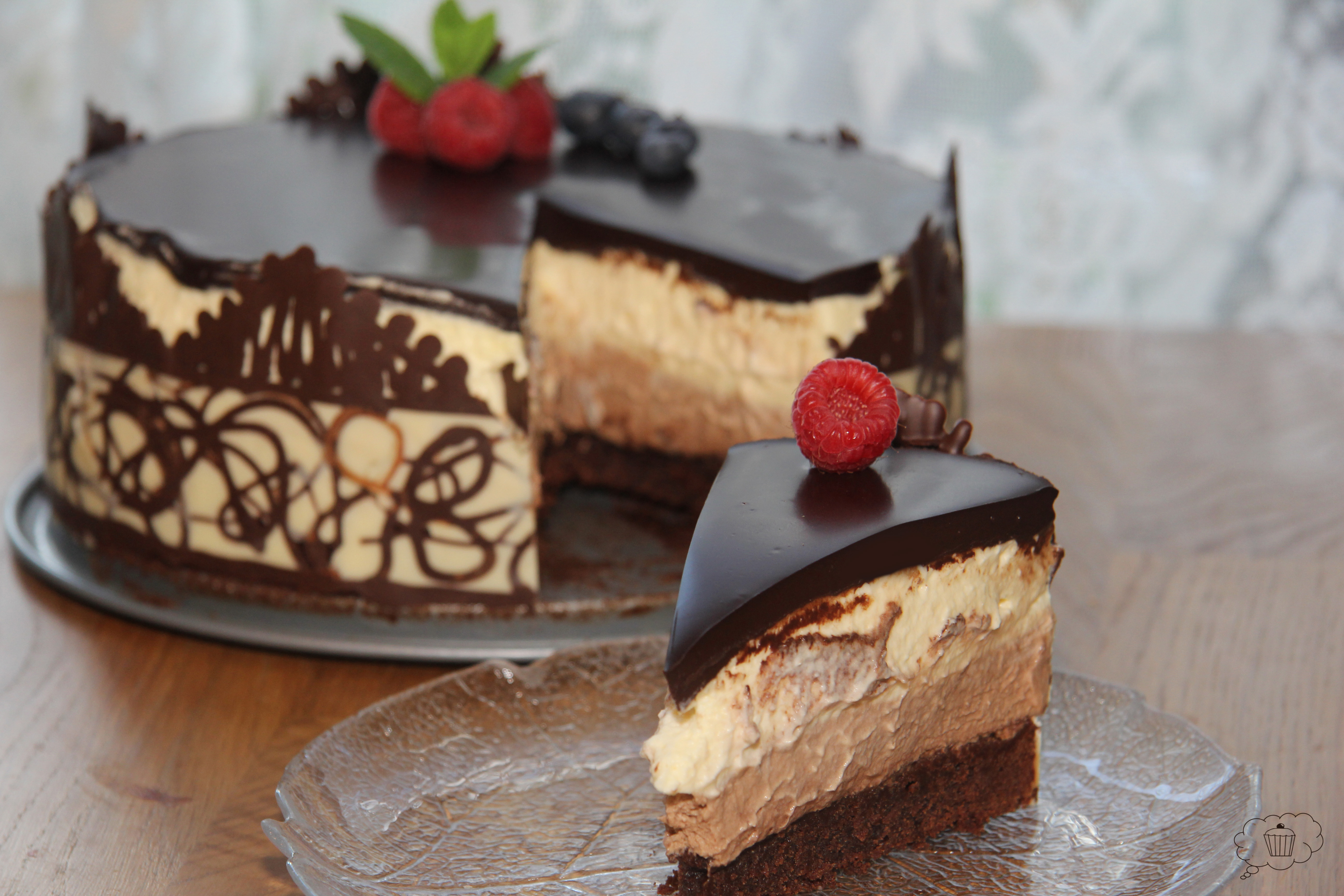 - Dekorera tårtan med färska hallon, blåbär och mynta samt chokladrosor eller spiraler.