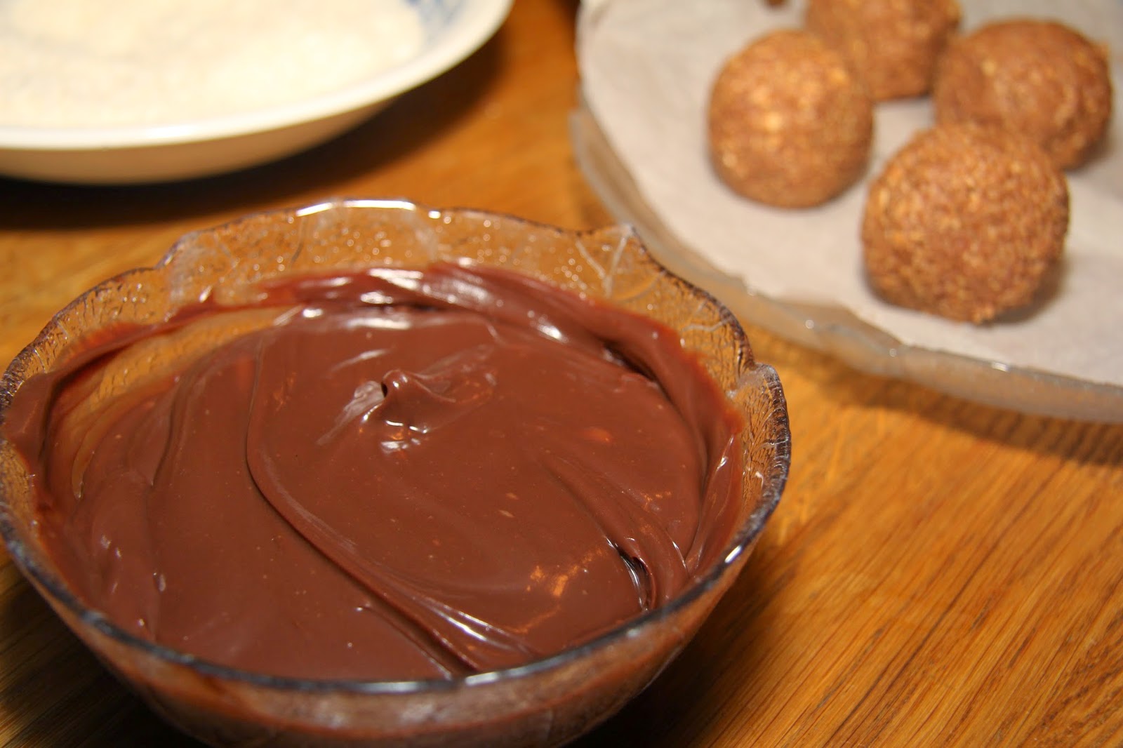 - Doppa biskvierna i den smälta chokladen så att all smörkräm täcks av choklad.