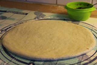 - Stretcha sedan ut pizzan varvat med att rotera den till en storlek på 21 cm i diameter. Tänk på att inte platta ut kanterna.