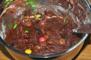 - Hacka chokladen om du inte använder chokladknappar. Rör ner chokladen så att de precis blir jämnt fördelade.