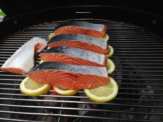 Varje laxbit ligger på tre citroner var – det både säkerställer att laxen inte fastnar på gallret och ger en god smak.