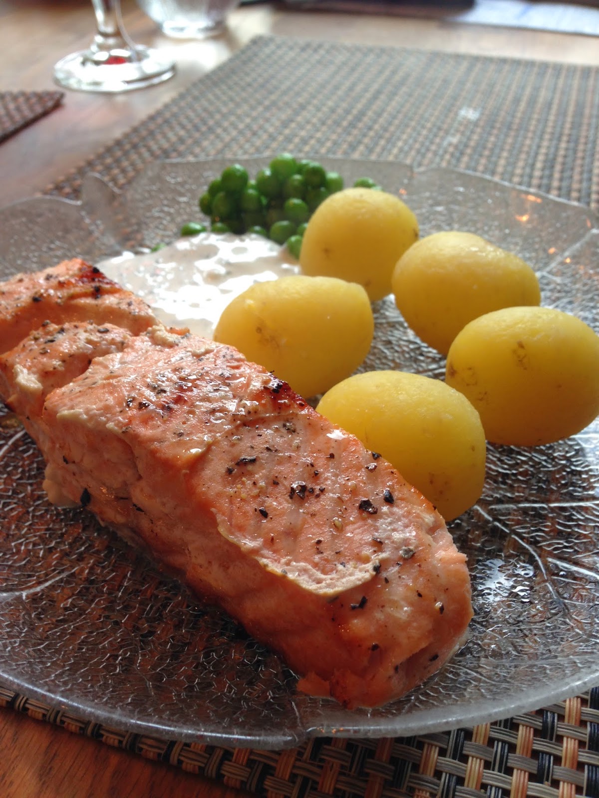 Grillad lax tillagad på citronbädd här serverat med kokt färskpotatis, kall örtsås och ärtor.
