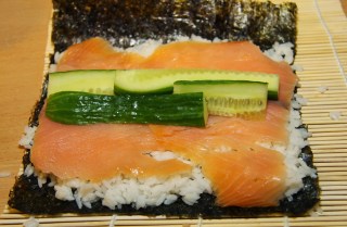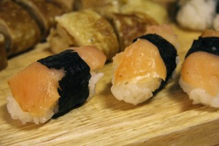 5. Montera ihop nigiri-sushin enligt följande; lägg en bit lax på den avlånga risbollen och bind en strimla nori runt sushin. Fäst med vatten.