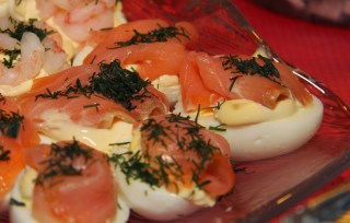 Dekorerade ägghalvor är väldigt gott till inlagd sill. De här ägghalvorna är dekorerade med bl.a. kallrökt lax.